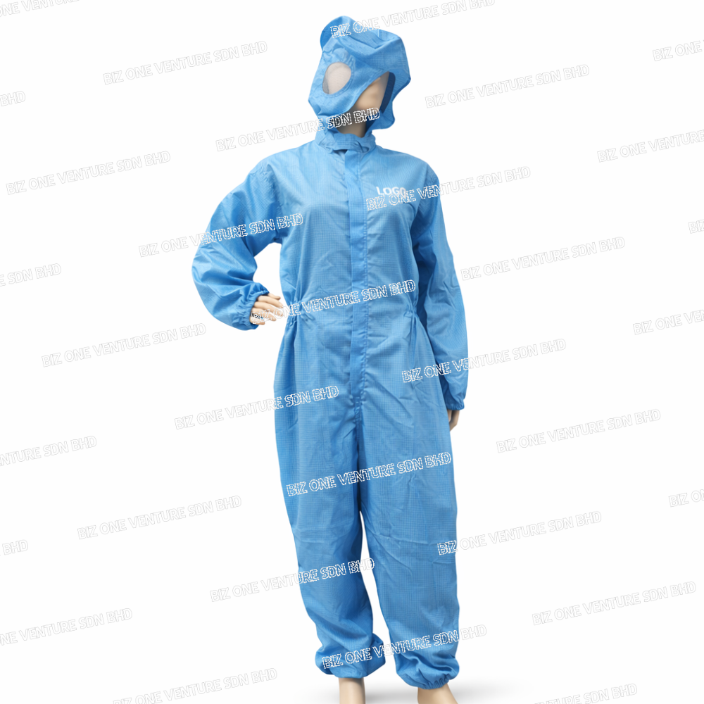 Made from conductive fabric stripe line or cross grid, the jumpsuit effectively release static charges while preventing dust buildup. Moreover, the attached hood provide complete coverage from head to ankle, ensuring full-body protection from static and airborne particles.